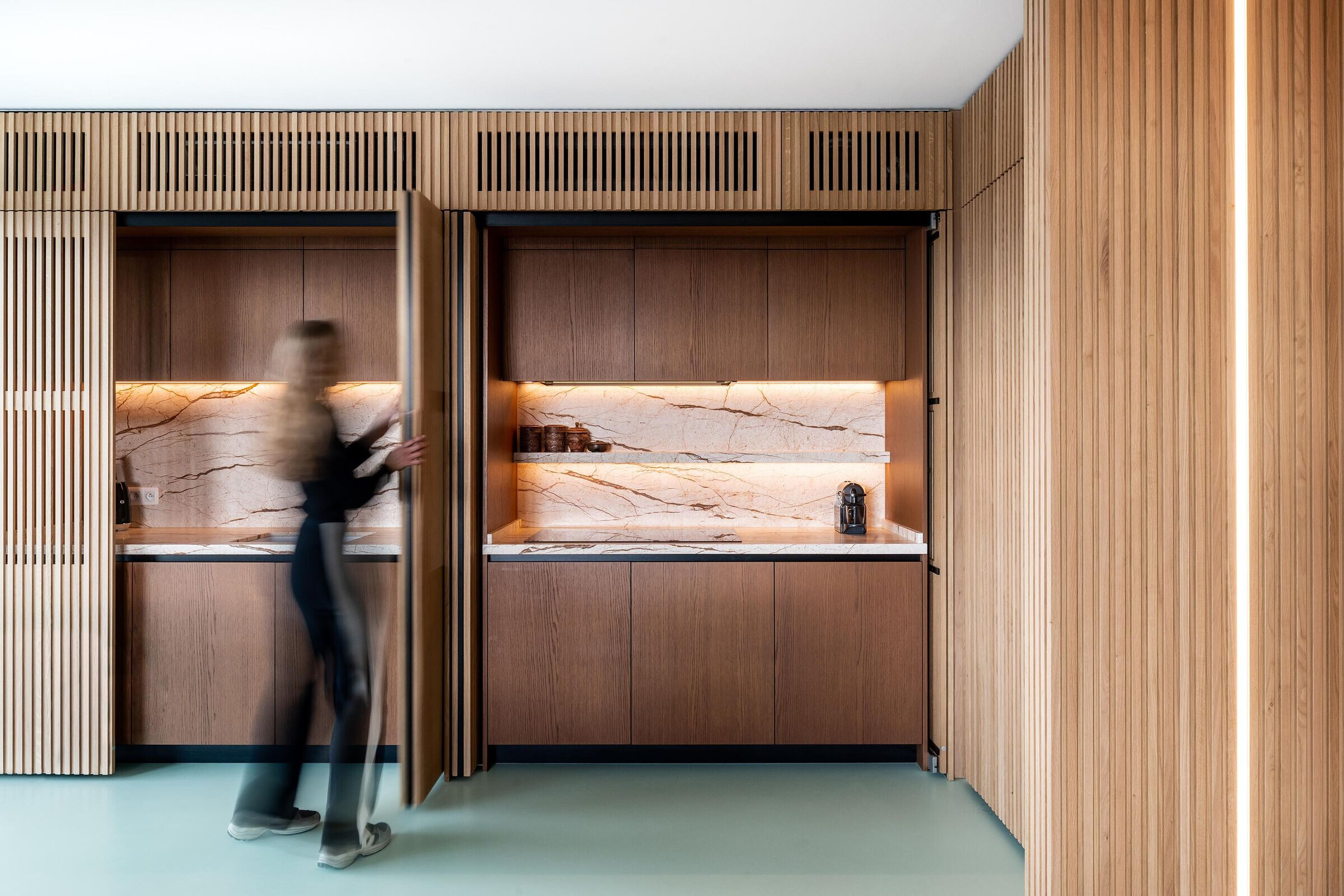 Een doordacht interieurconcept van VIVA Architecture voor een appartement op de tiende verdieping, met een adembenemend uitzicht over de Singel in Antwerpen—waar functionaliteit en beleving harmonieus samenkomen.